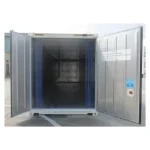 Pensé pour un usage quotidien, il est doté d’un sol plat riveté en tôle d’aluminium perforée (3mm) pour simplifier la manutention, tout en préservant la circulation de l’air. Un rideau à lanières PVC réduit les déperditions à l’ouverture.
